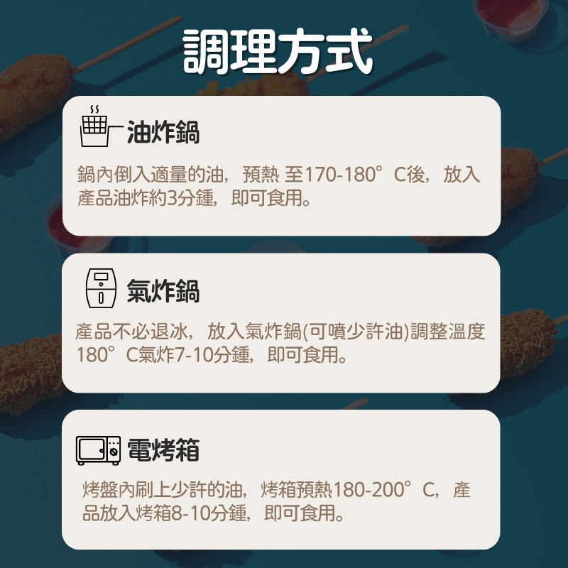 【 調 理 方 法 】 ⚠️ 注意:調理方式會因烤箱、氣炸鍋、油炸鍋品牌、功率不同而有些微差異,故提供給各位參考用。